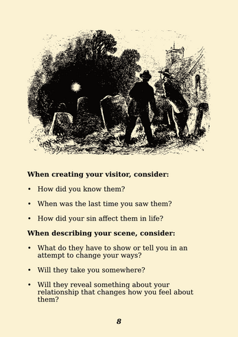 Create your character, give them a sin and describe how it affects the world around them. Then, create three ghosts that visit them during the night and narrate your conversations. Finally, they wake up, but how much time has passed? And are they able to fix all the harm they've caused in life?