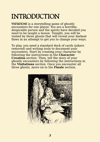 Visitations is a solo journaling game about a terrible person and three ghostly encounters. Use a deck of cards to get prompts about your character and the ghosts they meet, then narrate the conversations that happen between them.